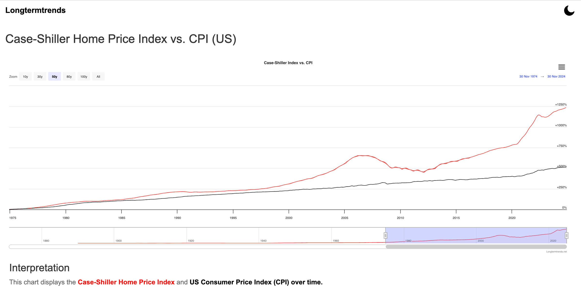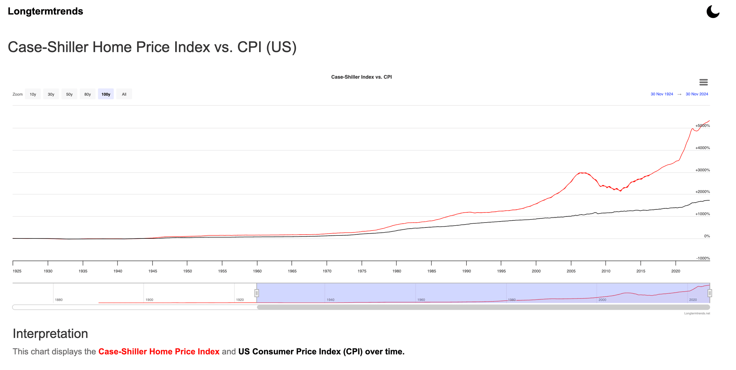 This chart compares the rise in the Case-Shiller U.S. National Home Price Index (the red line) against the Consumer Price Index (the black line).