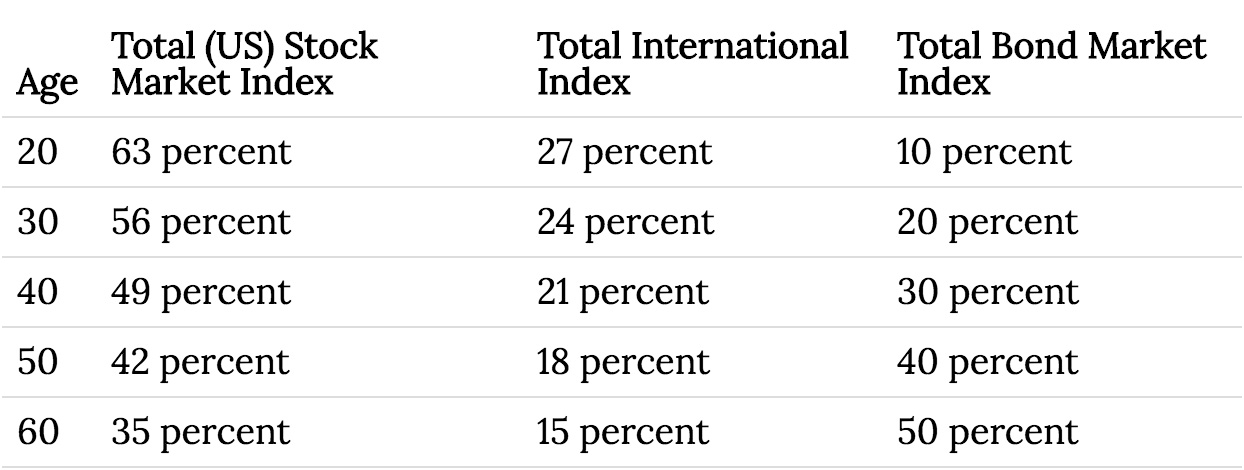 Your age minus 10 = the percentage you invest in bond funds, with the rest in stock funds. For example: